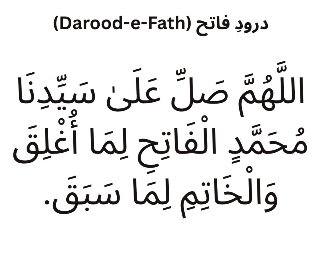 اللَّهُمَّ صَلِّ عَلَىٰ سَيِّدِنَا مُحَمَّدٍ الْفَاتِحِ لِمَا أُغْلِقَ وَالْخَاتِمِ لِمَا سَبَقَ.