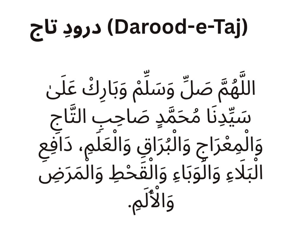 اللَّهُمَّ صَلِّ وَسَلِّمْ وَبَارِكْ عَلَىٰ سَيِّدِنَا مُحَمَّدٍ صَاحِبِ التَّاجِ وَالْمِعْرَاجِ وَالْبُرَاقِ وَالْعَلَمِ، دَافِعِ الْبَلَاءِ وَالْوَبَاءِ وَالْقَحْطِ وَالْمَرَضِ وَالْأَلَمِ.
