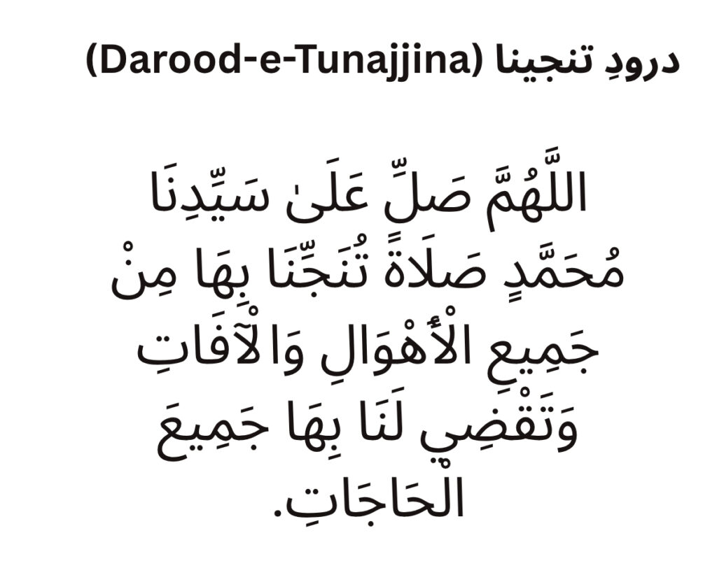 اللَّهُمَّ صَلِّ عَلَىٰ سَيِّدِنَا مُحَمَّدٍ صَلَاةً تُنَجِّنَا بِهَا مِنْ جَمِيعِ الْأَهْوَالِ وَالْآفَاتِ وَتَقْضِي لَنَا بِهَا جَمِيعَ الْحَاجَاتِ.