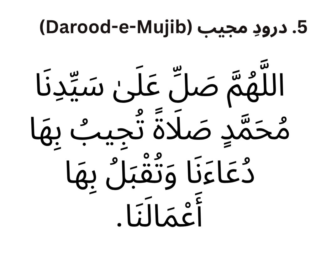 اے اللہ! ہمارے سردار محمد ﷺ پر ایسا درود نازل فرما جو ہمیں تمام خوف اور آفات سے نجات دے اور ہماری تمام حاجات پوری کرے۔