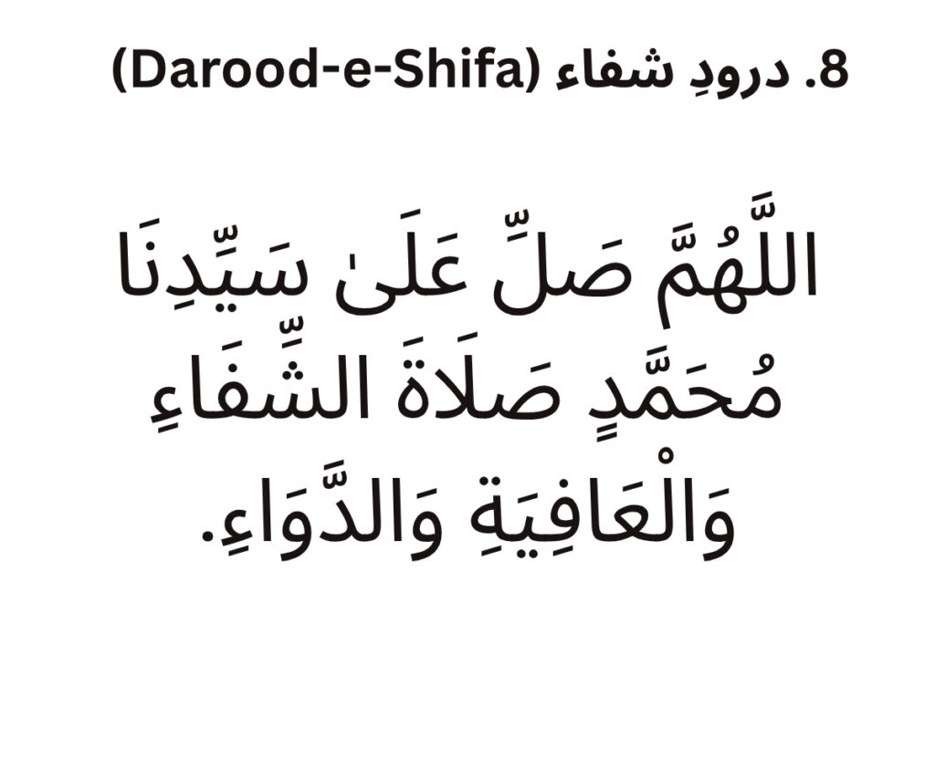 اللَّهُمَّ صَلِّ عَلَىٰ سَيِّدِنَا مُحَمَّدٍ صَلَاةَ الشِّفَاءِ وَالْعَافِيَةِ وَالدَّوَاءِ.