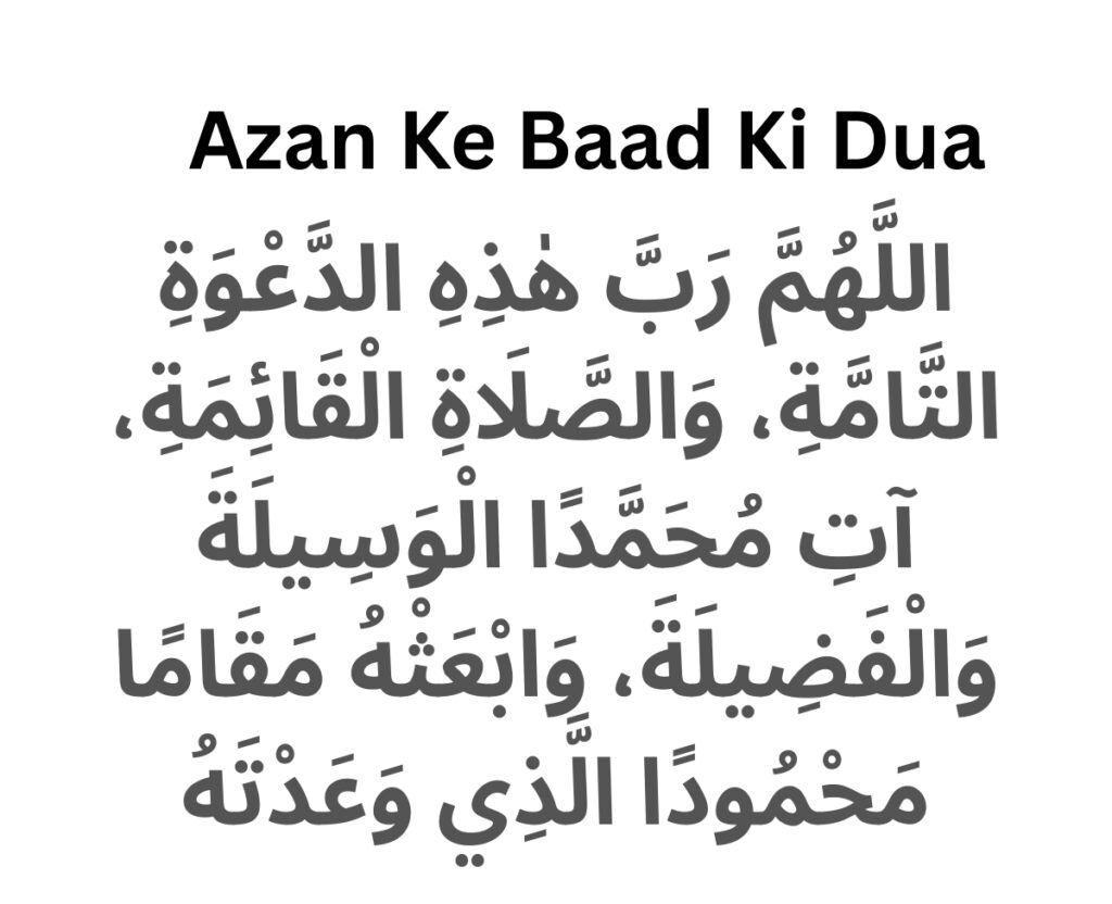 اللَّهُمَّ رَبَّ هٰذِهِ الدَّعْوَةِ التَّامَّةِ، وَالصَّلَاةِ الْقَائِمَةِ، آتِ مُحَمَّدًا الْوَسِيلَةَ وَالْفَضِيلَةَ، وَابْعَثْهُ مَقَامًا مَحْمُودًا الَّذِي وَعَدْتَهُ